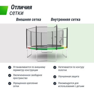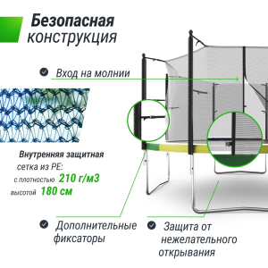 Каркасный батут с защитной сеткой безопасный подойдет для тренировок и просто для развлечений, он оснащен двусторонней молнией и дополнительными пластиковыми фиксаторами. Прыжки на батуте — это отличная аэробная нагрузка: улучшения общей физической формы, заряд положительными эмоциями, улучшение работы кардио системы, развитие чувства равновесия и координации, подойдет для пользователей любого возраста. Занятия на свежем воздухе укрепляют иммунитет, повышают выносливость.