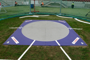 Переносной круг для метания диска, также для метания молота с переоборудованным кругом HCC-2135, несущая конструкция из стальных профилей и оцинкованных профилей, верхние элементы из противоскользящей фанеры толщиной 20 мм, 4 квадранта, скрепленные винтами, внутренний диам. 2500 мм.