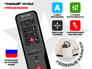 Управление креслом максимально простое и интуитивно понятное благодаря пульту на русском языке. Вы можете выбрать одну из 3 автоматических программ массажа или настроить 3 уровня интенсивности 3D массажа спины. Доступны 3 зоны массажа спины: верхняя, нижняя и вся спина.