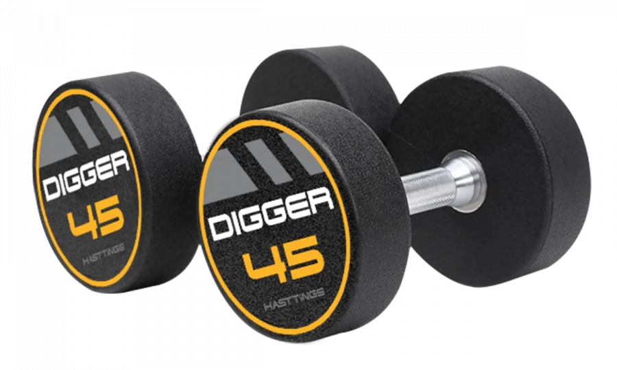 Комплект полиуретановых гантелей Hasttings DIGGER представляет собой набор из 5 пар стальных гантелей с уретановым покрытием весом от 40 до 50 кг c шагом в 2,5 кг.