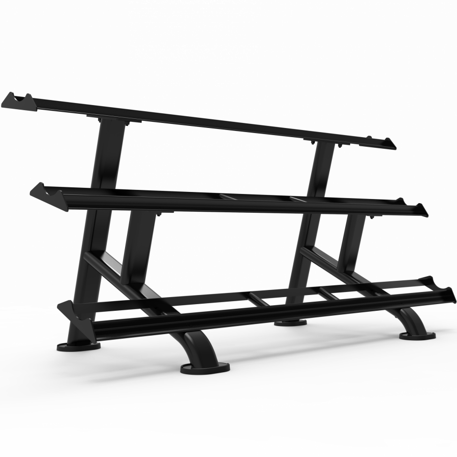 - Трёхъярусная конструкция позволяет разместить до 15 пар гантелей (по 5 пар на каждом ярусе).