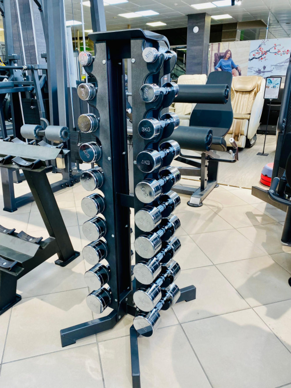 Стойка подходит для хранения гантелей ряда CHROME и гексагональных обрезиненных гантелей PROFI-FIT весом 1-10 кг, длиной рукояти не менее 110 мм.