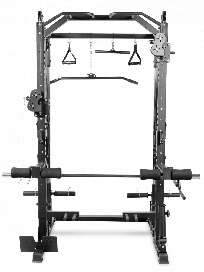 OXYGEN FITNESS TREVIS - это универсальный силовой комплекс с полноценной машиной Смита, созданный для эффективных домашних тренировок с функционалом профессионального уровня. Конструкция работает со свободными весами и обеспечивает безопасное выполнение десятков упражнений: от жима и приседаний до тяг, кроссоверных движений и тренировок корпуса.