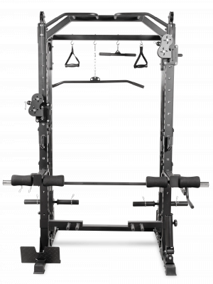 Максимальная нагрузка — 250 кг, что делает комплекс подходящим как для продвинутых спортсменов, так и для тех, кто строит свою силовую базу дома. Основу комплекса составляет усиленная рама прямоугольного профиля 70×50 мм с толщиной металла 2 мм, обеспечивающая жёсткость, устойчивость и плавный ход всех узлов.