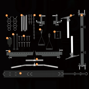 В комплекте прямой гриф, w-образный гриф, цепь с карабином и прямой рукоятью, канатная рукоять, двойная рукояти, пара д-образных рукоятей. Дополнительное оборудование можно хранить на задней стенке станции.