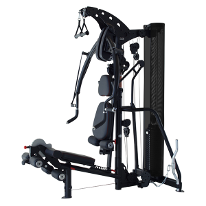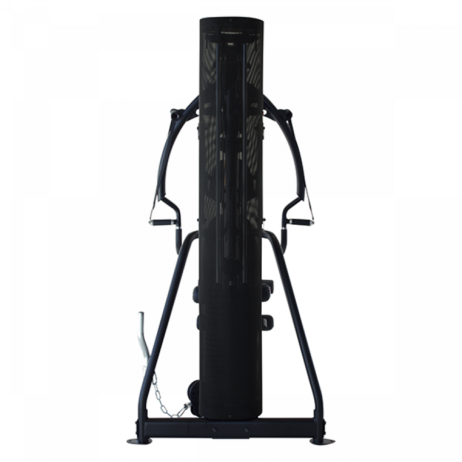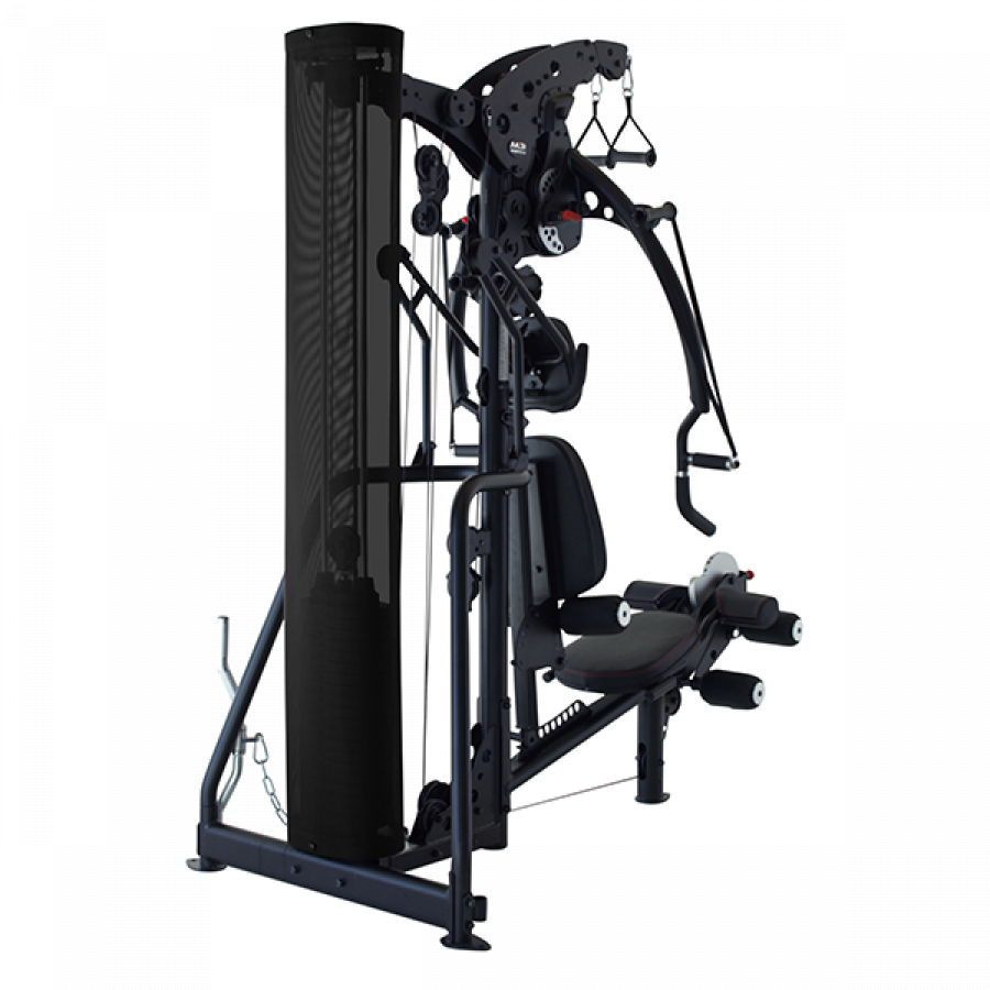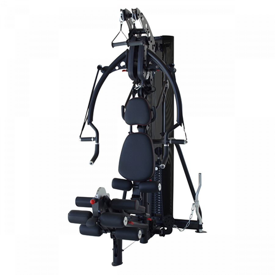 Одинарный весовой стек на 98 кг защищен кожухом из прочной сетки, что снижает шум во время занятий. В конструкцию входят верхний и боковой тяговые блоки, основная жимовая рама, срединный блок (над спинкой), блок с подушкой для скручиваний, жимовые стрэп-рукояти и тренажер для сгибания и разгибания ног.