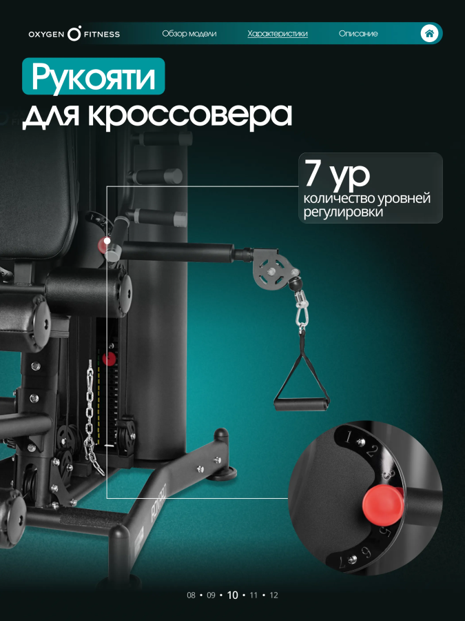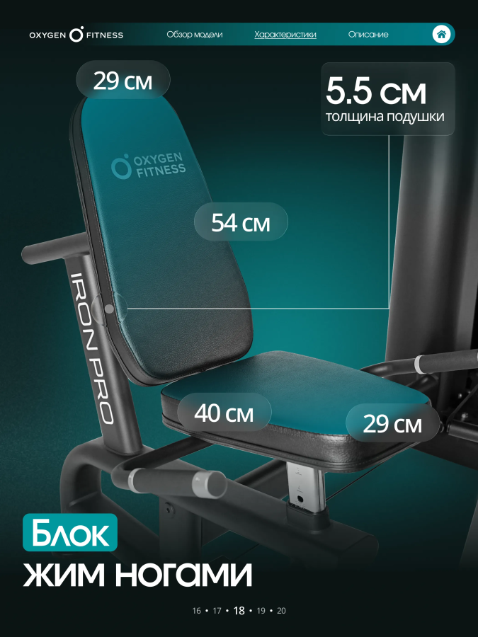 Несмотря на расширенный функционал, тренажер сохраняет удобные габариты для размещения в фитнес-пространстве: длина — 210 см ширина — 202 см высота — 220 см OXYGEN FITNESS IRON PRO — это универсальная силовая станция с расширенным функционалом и профессиональной надежностью. Она объединяет высокую прочность конструкции, плавную работу механизмов и комфортную эргономику, позволяя проводить полноценные силовые тренировки на одном тренажере.