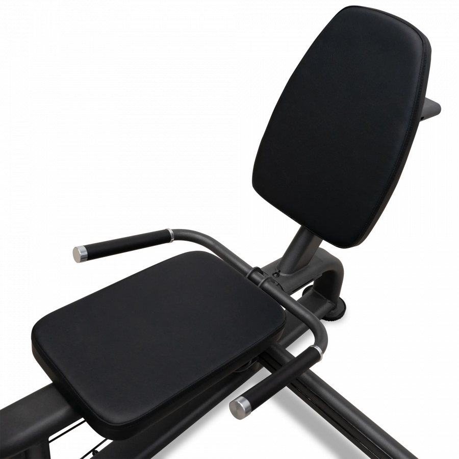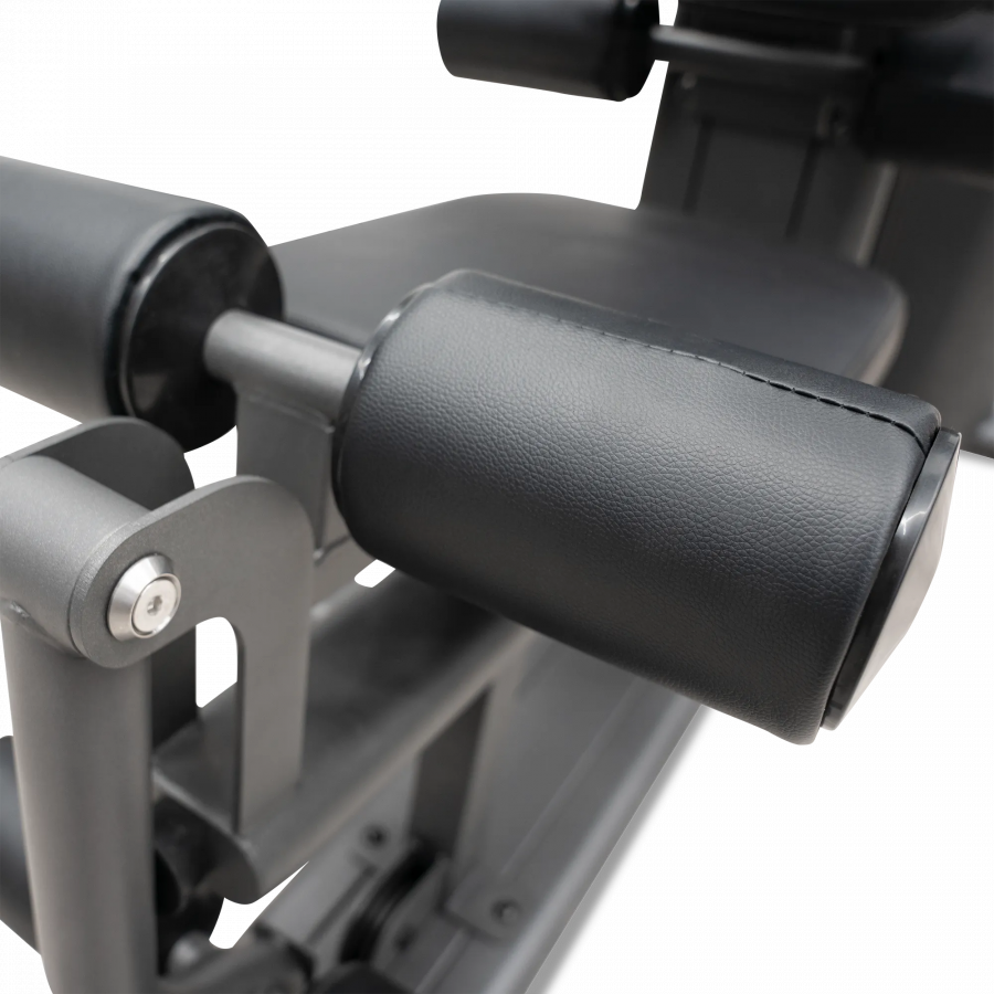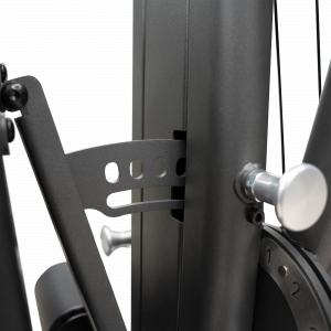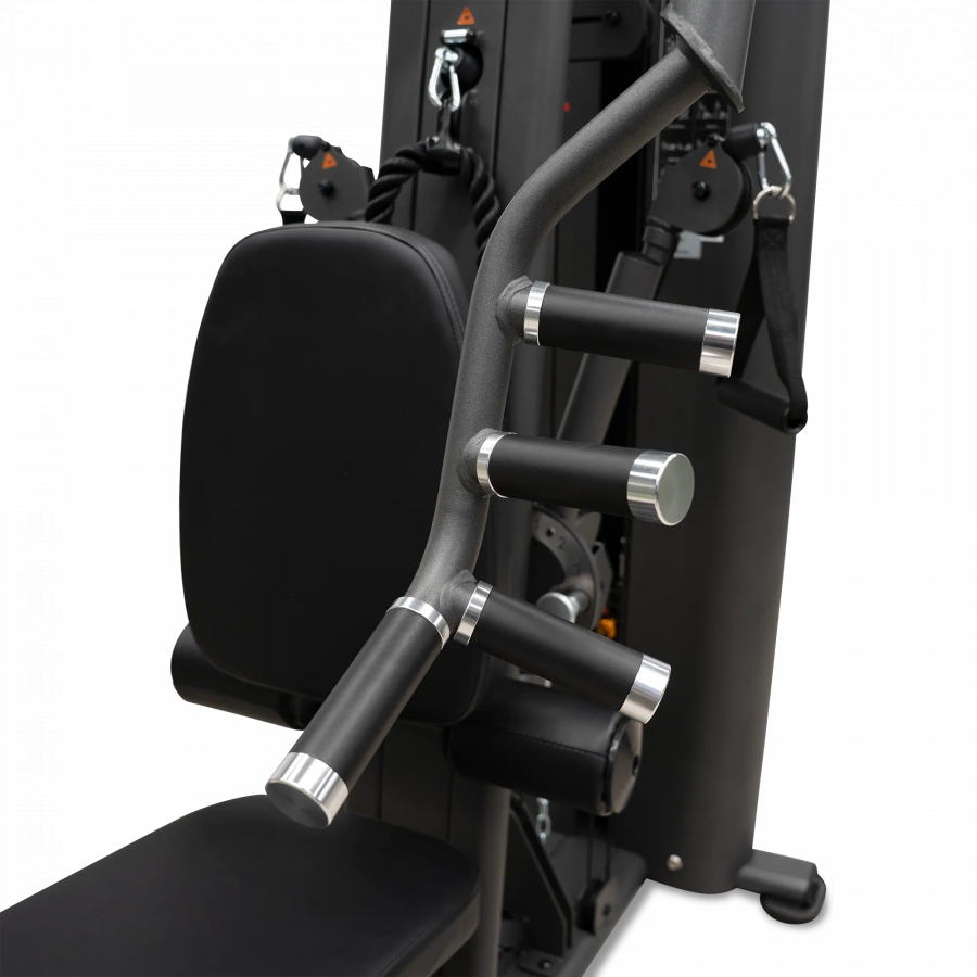 В комплект входят регулируемые по высоте элементы: тяга (кроссовер) — 7 уровней, спинка — 5 уровней, сиденье — 4 уровня, а также регулировка для жима от груди — 11 уровней. Эргономичное сиденье с наполнителем из PU-поролона и обивкой из искусственной кожи обеспечивает комфорт и поддержку во время тренировки. Для упражнений жим ногами предусмотрено 6 позиций регулировки спинки, а размеры подушек и валиков — оптимальны для комфортного выполнения различных упражнений.