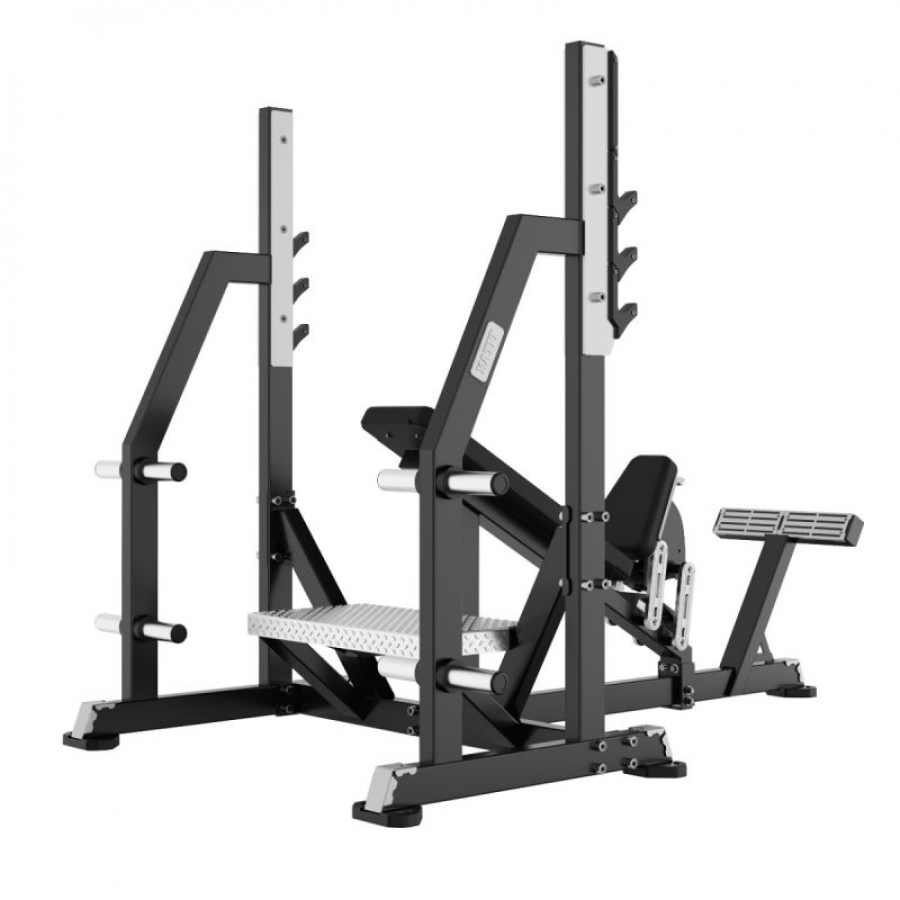 Скамья-стойка для жима под углом вверх предназначена для проработки верхней части грудных мышц, передних дельтовидных и трицепсов. Трёхуровневые упоры с шестью ложементами позволяют безопасно фиксировать штангу на удобной высоте. Эргономичные сиденье и спинка обеспечивают устойчивое положение и комфорт во время подхода, а регулируемое по высоте сиденье позволяет адаптировать тренажёр под пользователей разного роста. Опорная площадка для страхующего выполнена из хромированного листа с рифлением для надёжного сцепления обуви и устойчивости при страховке. Конструкция устойчива, рассчитана на интенсивную эксплуатацию и соответствует международным стандартам качества.