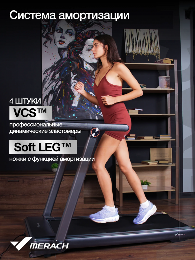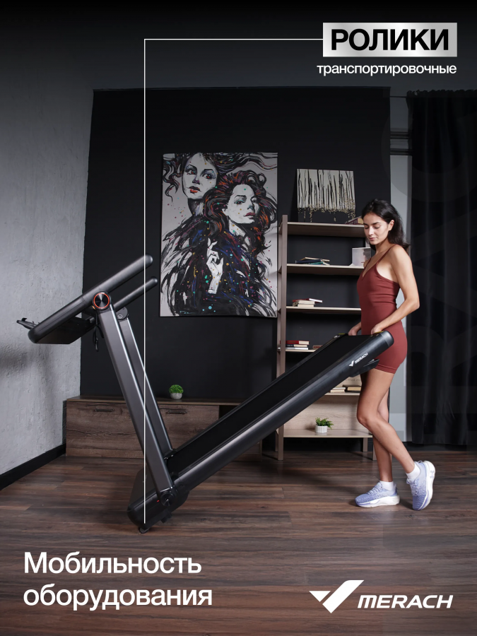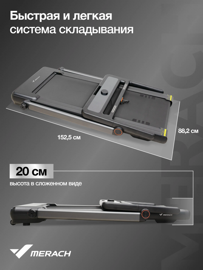 Беговая дорожка MERACH MR-T07 имеет складную конструкцию, что облегчает её хранение и перемещение благодаря транспортировочным роликам. Удобная подставка для планшета или смартфона позволяет заниматься с любимыми развлечениями, а USB-разъем для зарядки устройства обеспечивает дополнительный комфорт. Также предусмотрены сенсорные датчики на поручнях для измерения пульса, что позволяет контролировать состояние во время тренировки. Беговая дорожка MERACH MR-T07 — это ваш надежный партнер на пути к активному и здоровому образу жизни! Ключевые преимущества MERACH MR-T07: