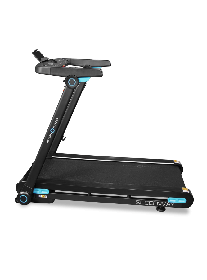 OXYGEN FITNESS SPEEDWAY — функциональная домашняя беговая дорожка с электронным углом наклона, продвинутой амортизацией и интерактивной интеграцией с Kinomap™. Бесщеточный двигатель 2.25 л.с. Fuji Electric (пиковая мощность 4.4 л.с.) обеспечивает стабильную и тихую работу.