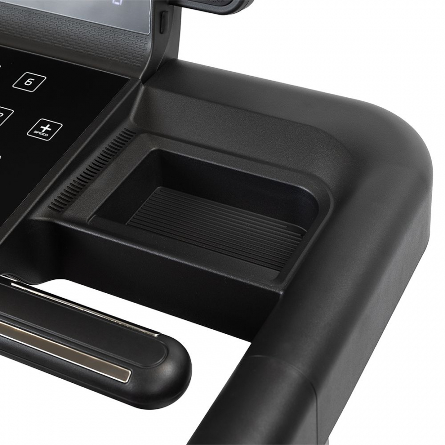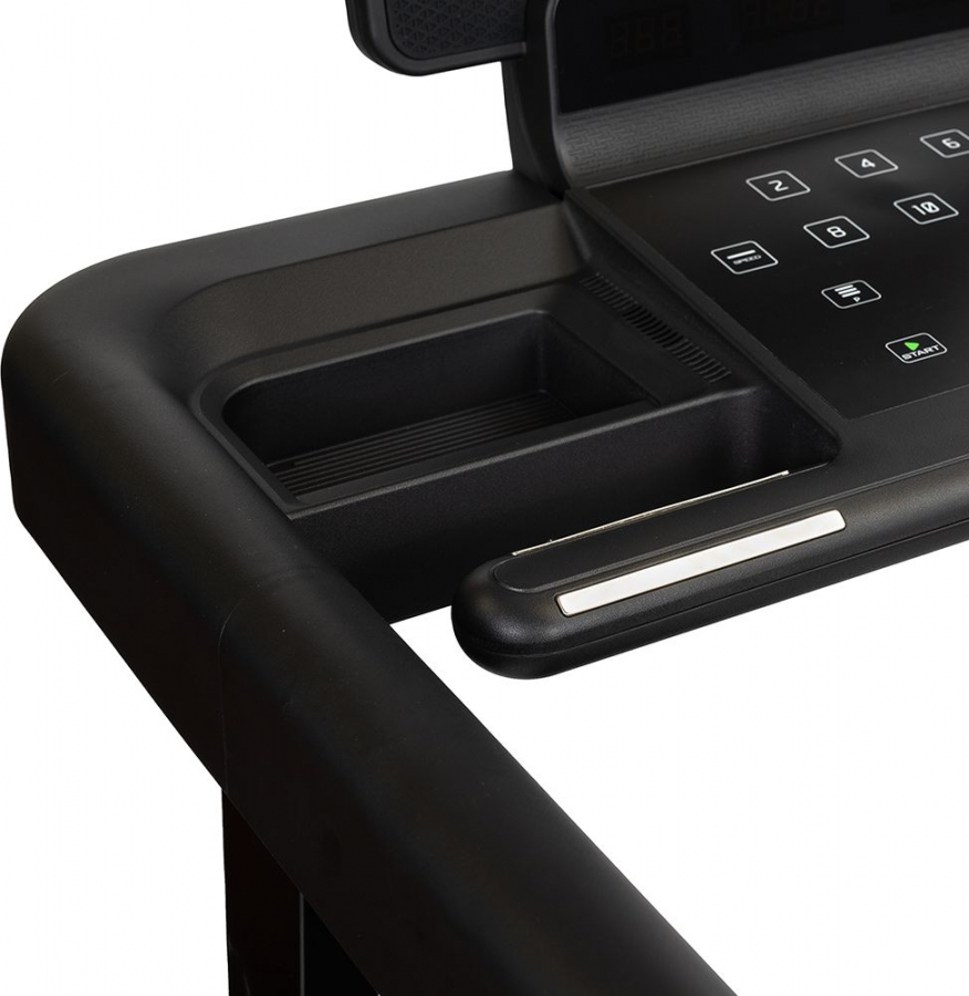Тренировочный компьютер представлен голубым LCD-дисплеем диагональю 5 дюймов (12,7 см) c сенсорными клавишами. На экран одновременно выводятся все основные параметры тренировки - время, скорость, дистанция, угол наклона, потраченные калории и пульс. В программный пакет входят 15 предустановленных программ, направленных на тренировку скоростных качеств, выносливости, укрепления сердечно-сосудистой системы и похудания, а также 3 программы обратного отсчета (время, дистанция, калории). Для считывания показаний пульса в поручни дорожки вмонтированы контактные сенсорные датчики. Благодаря быстрым клавишам управления можно отрегулировать скорость либо угол наклона, не снимая рук с поручней.