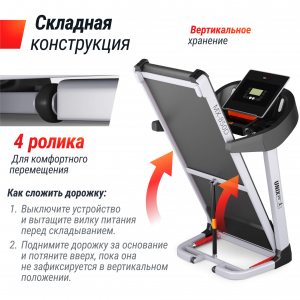 Размеры электрической беговой дорожки в рабочем состоянии составляют 179 х 83 х 143 см, позволяя заниматься на ней пользователям до 140 кг. Рама спортивного тренажера изготовлена из высокопрочной стали, что гарантирует стабильность и безопасность во время интенсивных тренировок.