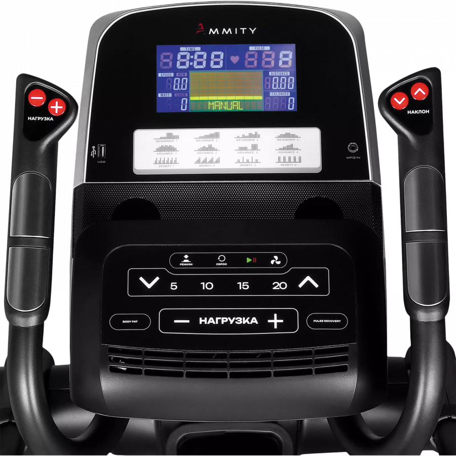 Эргометр Ammity PE 540 AI премиальной линейки Premium — это мощный индукционный эргометр с электрическим подъемником рампы и регулируемым углом наклона педалей для разноплановых и интенсивных тренировок, подходит для пользователей с любым уровнем подготовки. Надежный и высококачественный тренажер на мощной цельной раме, рассчитан на эксплуатацию пользователями до 180 кг. Прочный двойной алюминиевый трек и прорезиненные ролики гарантируют стабильность и тишину хода, конструктивно исключено соскальзывание педали с трека. Электрическое изменение наклона поднимает трек от 1 до 20 уровней, расширяет вариативность тренировок, меняет акцент нагрузки, увеличивая эффективность занятий и позволяет максимально глубоко прорабатывать все группы мышц, также индивидуально адаптирует тренажер, обеспечивает наиболее удобное положение спортсмена в зависимости от комплекции и спортивной подготовки. Инновационное исполнение педально-рычажного механизма Move BioMech™ на подвижном креплении к приводу и использование шарнирных подшипников Fish Eye позволяет создать плавающие плоскости траектории движения. Большой, глубокий шаг длиной 540 мм, оптимальная высота шага 145 / 155 / 163 / 190 / 200 мм, минимальный Q-фактор — 105 мм, создают лучшую траекторию движения для высокой продуктивности занятий и полной безопасности суставов. Плавный, мягкий ход, равномерное сопротивление и правильная посадка на тренажере обеспечивают комфорт даже при длительных интенсивных занятиях. Комфорт и высокая эффективность достигнуты благодаря продуманной конструкции, эргономике поручней, использованию новых технологий, применению высококлассных коммерческих комплектующих и подшипниковых соединений. Качественная заводская сборка гарантирует долгий срок эксплуатации. Надежная конструкция и тяжелая рама — это безопасность и комфортное размещение в диапазоне роста от 160 до 215 см, без ограничения возраста.