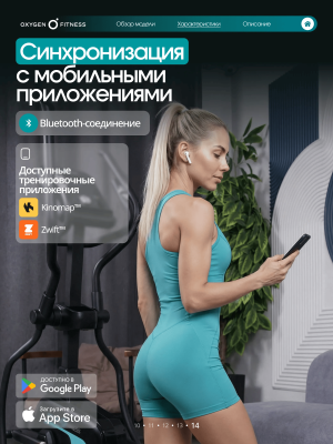 Тренажёр поддерживает Bluetooth-подключение к популярным приложениям Kinomap™ и Zwift™ с интерактивным уровнем интеграции, что делает тренировки более вовлекающими и разнообразными.