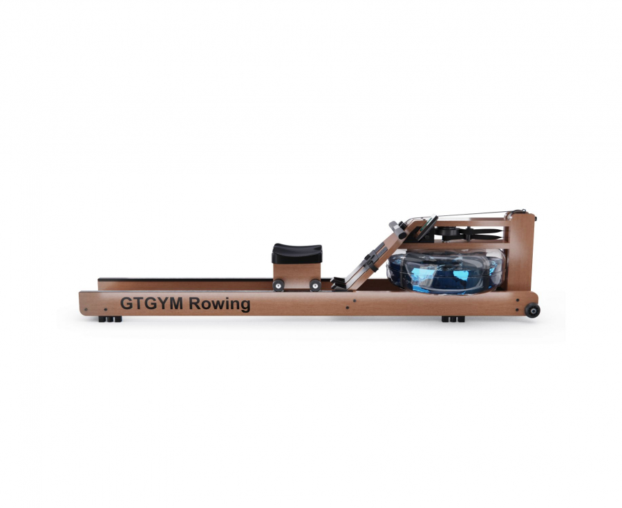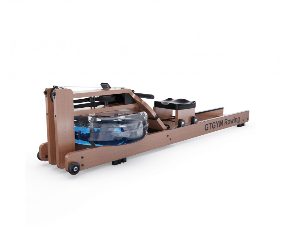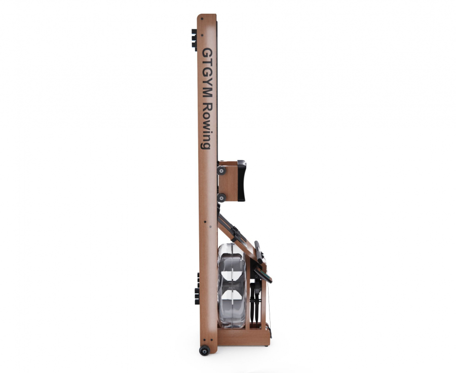 Консоль гребного тренажёра GTGYM Frank имеет 8 уровней регулировки педалей и показывает время, расстояние, калории, пульс и обороты в минуту. Система нагрузки является водной: чем больше вы зальёте в бак воды, тем больше будет нагрузка. Транспортировочные ролики позволяют легко перемещать тренажёр, а его размер в сложенном виде составляет 60 x 56,5 x 210 см.