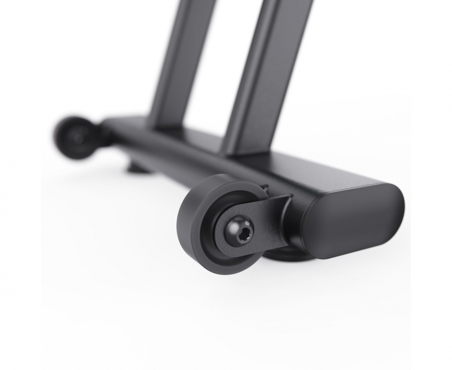 Рифленые педали с регулируемыми ремешками обеспечивают надежную фиксацию ног, а подставка под планшет позволяет использовать устройства для удобства во время тренировки. Также есть компенсаторы неровности пола, которые гарантируют стабильность тренажера, а транспортировочные ролики обеспечивают лёгкое и удобное перемещение, позволяя без труда менять его расположение в помещении.