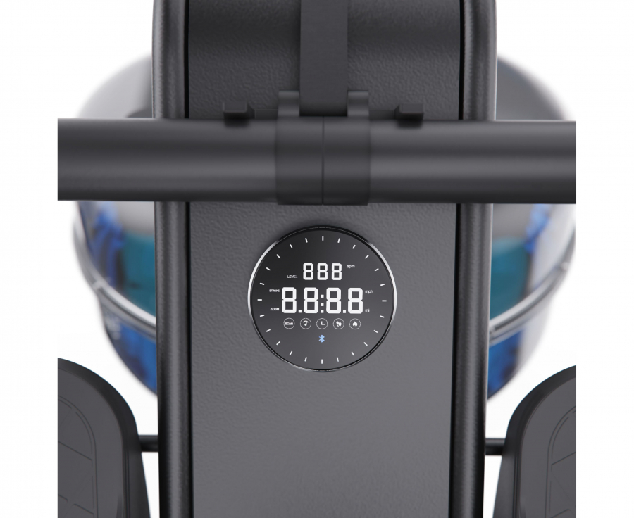 Тренажёр оснащён круглым LED-дисплеем с современным дизайном, который отображает основные показатели тренировки: калории, дистанция, время, скорость, сканирование, время на 500 м, количество гребков, уровень сопротивления и частота гребков. Подключение через Bluetooth к приложениям FITLOG и KINOMAP позволяет тренироваться с дополнительной мотивацией и отслеживать прогресс.