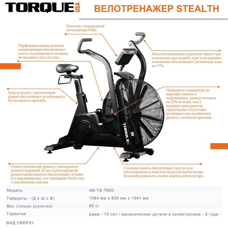 Компания Torque разработала велотренажер Stealth Air Bike AB-TS-T800-INTL-102-F07, который выдержит интенсивное использование и обеспечит плавный и тихий ход: увеличенная трубчатая рама, ось из закаленной легированной стали, одноступенчатый кевларовый ремень и др.