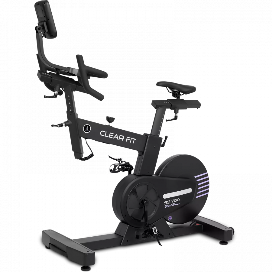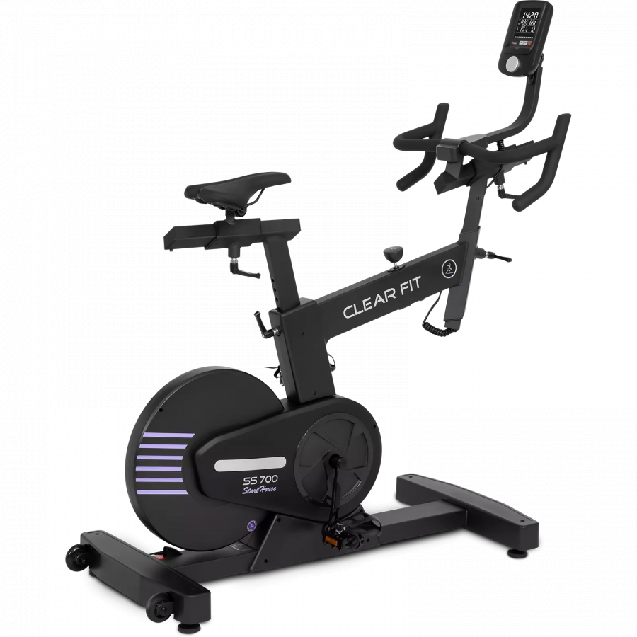 Мощный велотренажер для сайклинга Clear Fit SS 700 домашней серии StartHouse для интенсивных тренировок, идеально имитирует езду на велосипеде, сочетает в себе достоинства спин — байка и классического велотренажера, что позволяет проводить широкий спектр разноплановых тренировок, от оздоровительных кардиотренировок до высокоинтенсивных интервальных и жиросжигающих. Модель отличается удобном ортопедическим седлом с силиконовыми вставками, важно для длительных или классических тренировок. Электронная регулировка нагрузки и электромагнитная система нагрузки EddyCurrent™ дают возможность использовать 24 уровня нагрузки. Большой запас сопротивления, максимальные уровни под силу не каждому профессионалу, при этом тренажер практически бесшумный, в отличии от классических спин-байков и цепных сайклов. Оптимален для повышения выносливости, придания рельефа мышцам «сушка» и быстрого снижения веса. Надежная тяжелая рама и адаптивные регулировки сиденья и руля обеспечивают безопасность при активных и подвижных занятиях на любой скорости и нагрузке. Тренажер подойдет для всей семьи, предусмотрен широкий диапазон регулировок посадки и руля под любую комплекцию. Современная консоль оборудована целевыми программами и встроенным кардиоприемником (HRC), который позволяет использовать беспроводной датчик пульса 5 кГц