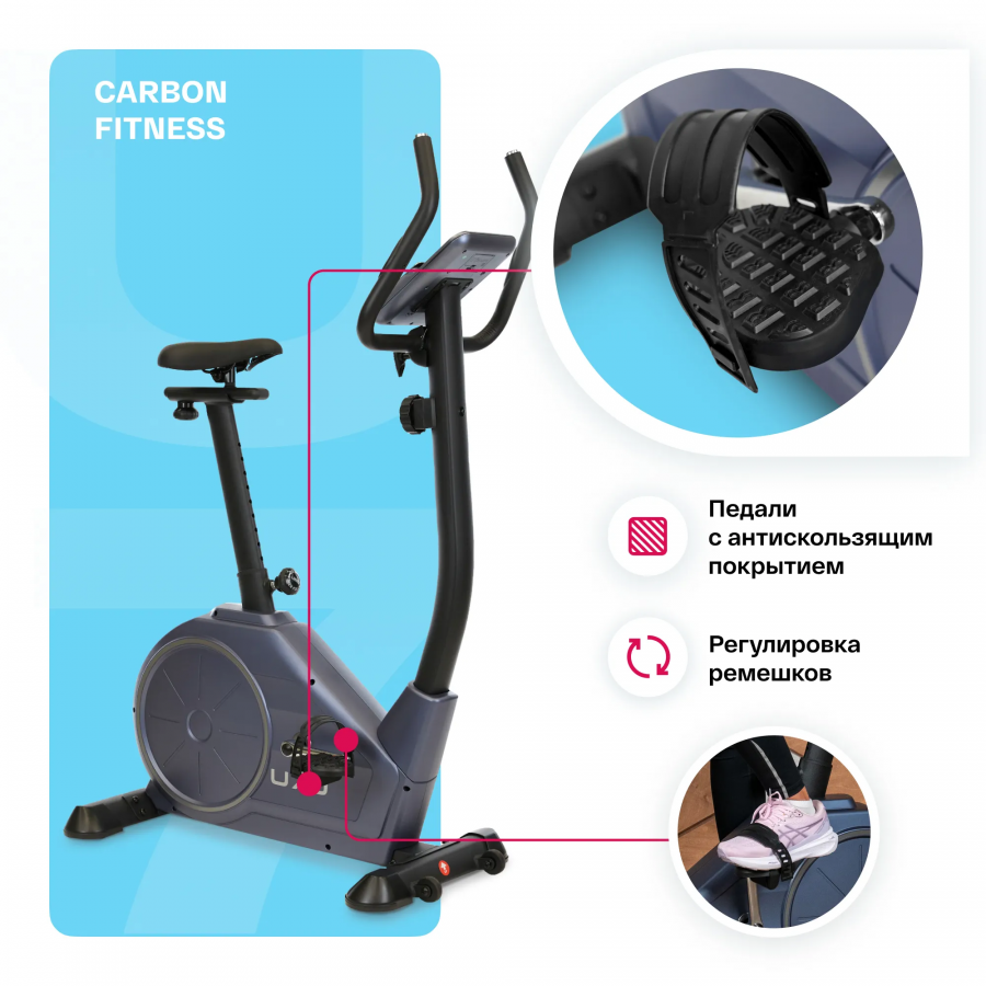 CARBON FITNESS U70 поддерживает пользователей до 140 кг, что делает его доступным для всех членов семьи. Прорезиненные педали с регулируемыми ремешками обеспечивают дополнительную безопасность, а транспортировочные ролики позволяют легко перемещать тренажер по дому.